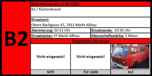 Um 10:11 Uhr wurden unsere Einsatzkräfte mittels Sirene und Handy-Alarmierung zu einem Küchenbrand nach Markt Allhau gerufen. Kurz darauf rückte unsere Feuerwehr mit KLF und 5 Mann zum Einsatz aus. Nach dem Eintreffen unserer Einsatzkräfte am Einsatzort hatte die örtlich zuständige Feuerwehr aus Markt Allhau das Ereignis schon unter Kontrolle, so das ein Eingreifen unsererseits nicht mehr notwendig war. Wir rückten daher nach wenigen Minuten wieder ein.