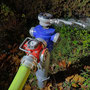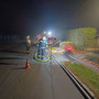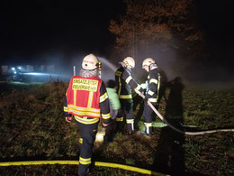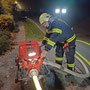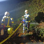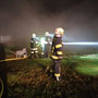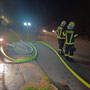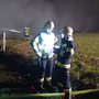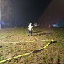 Diese rückten unmittelbar danach aus, wobei der Tank in unmittelbarer Nähe des fingierten Brandobjektes Aufstellung nahm und sofort mit der Brandbekämpfung mit 2 C-Strahlrohren begann. Das KLF  und dessen Gruppe musste inzwischen die Versorgungsleitung vom Hydranten zum Tank herstellen, was mit annähernd 10 B-Leitungen bewerkstelligt werden konnte. Da direkt neben der Straße operiert wurde und Dunkelheit herrschte, musste entsprechend abgesichert und eine Beleuchtung aufgebaut werden. Um ausreichend Wasserdruck zu haben, wurde unsere bewährte TS (Tragkraftspritze) nach einer B-Länge zwischengeschaltet, dies ermöglichte es – trotz geringem Ausgangsdruck des Hydranten – die Steigung und den Druckverlust durch die lange Versorgungsleitung zu überwinden. Im Realfall hätte der Tank nur für etwa 10 -15 Minuten Wasser geliefert, durch die Versorgungsleitung und entsprechender Feinabstimmung bei den beteiligen Pumpen (TS/Tank) konnte dieser laufend wieder aufgefüllt werden. Schließlich wurde Brand AUS gegeben, nach dem Abbau aller Geräte und Leitung erfolgte eine Übungsbesprechung bzw – kritik, die durchwegs positiv ausfiel und uns entsprechende Erkenntnisse zur Wasserversorgung lieferte.