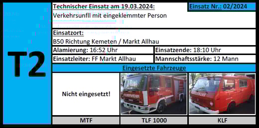 Gestern kurz vor 17:00 Uhr wurden die Einsatzkräfte der FF Buchschachen mittels Sirene und Handy – Alarmierung zu einem technischen Einsatz mit dem Alarmtext „Verkehrsunfall mit eingeklemmter Person“ auf die B50 nach Markt Allhau gerufen. Kurz darauf rückte unsere Wehr unter dem Kommando von HBI Benedek mit 12 Mann, einem Tanklöschfahrzeug (TLF 1000) und einen Kleinlöschfahrzeug (KLF) aus.