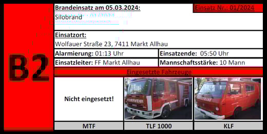 Um 01:13 Uhr wurden die Einsatzkräfte der FF Buchschachen mittels Sirene und Handyalarmierung zu einem Brandeinsatz nach Markt Allhau gerufen. Ein Silo einer Tischlerei stand in Flammen. Wir unterstützten die Kameraden aus Markt Allhau mittels Atemschutzgeräteträgern und führten mittels 2 C-Rohren einen Aussenangriff durch.